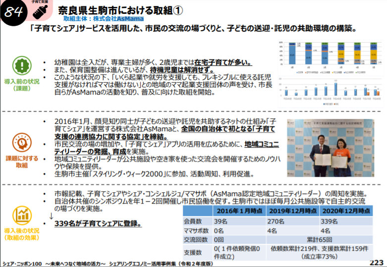 内閣官房シェアリングエコノミー促進室「シェア・ニッポン100~未来へつなぐ地域の活力~令和2年度版」に、自治体や民間事業者等が地域における社会課題の解決や経済活性化を行うためにシェアリングエコノミーを活用している事例としてAsMamaの取り組みが掲載されました。